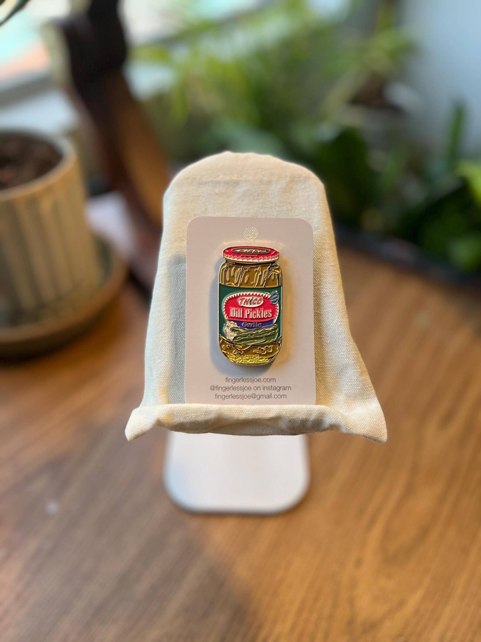Materials: enamel, metal, rubber backing, two anchor points 2” x 1” enamel pin “rick’s thicc dill pickles”