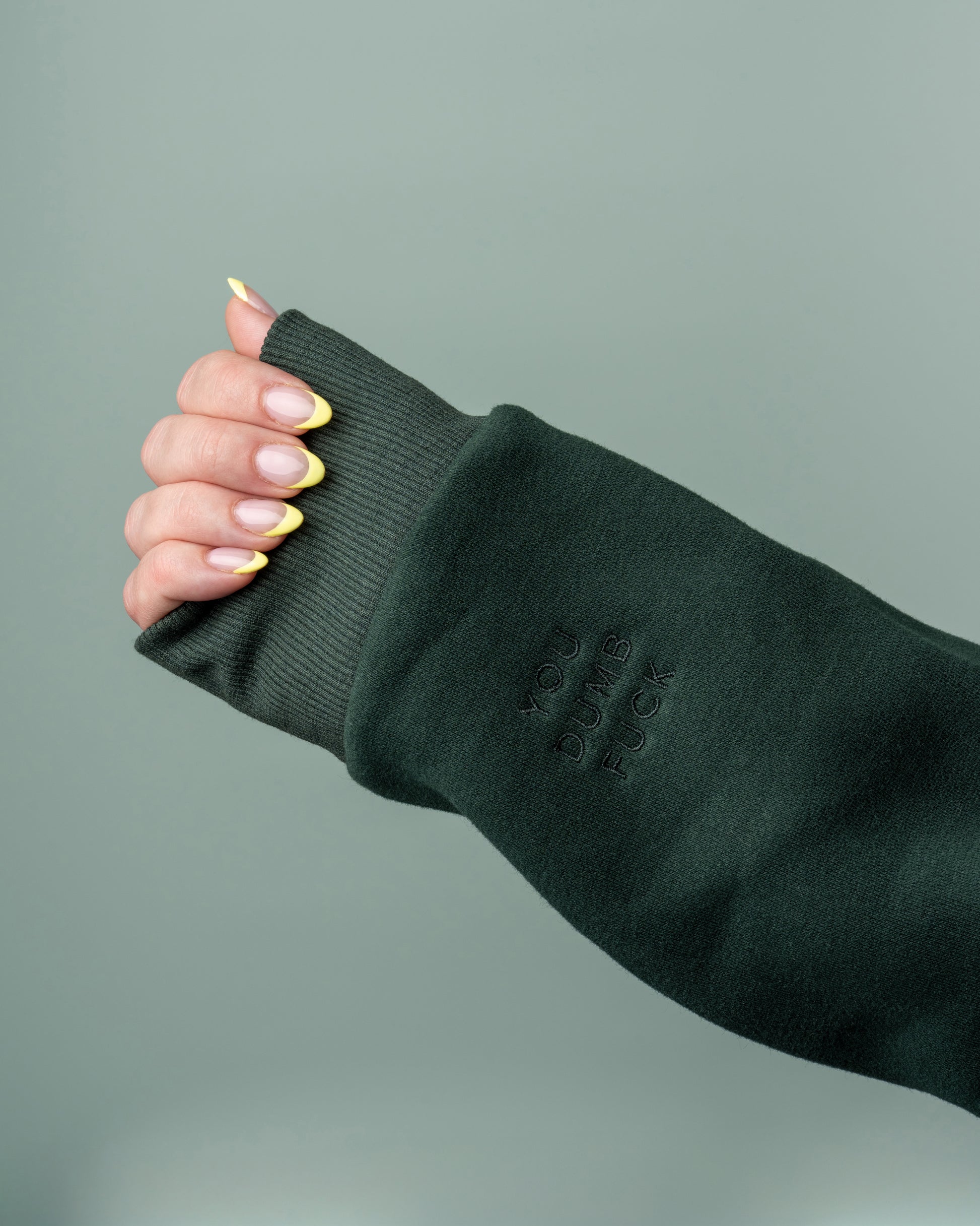 Features 'I'M NOT ARGUING I'M EXPLAINING WHY I'M RIGHT" embroidered on the chest and "YOU DUMB FUCK" on the right cuff of this dark green super cozy hoodie.